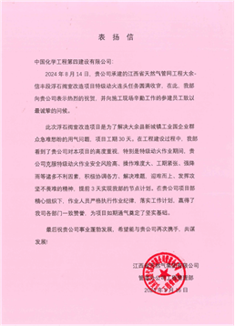 近日,江西省天然氣集團有限公司發(fā)來表揚信,對華北公司圓滿完成江西省天然氣管網(wǎng)工程大余-信豐段浮石閥室改造項目的特級動火連頭任務(wù)表示贊揚。