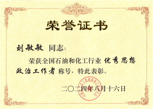 劉敏敏獲評全國石油和化學工業(yè)優(yōu)秀思想政治工作者