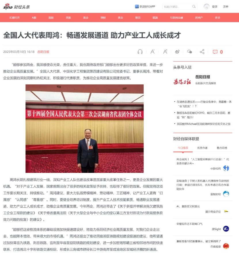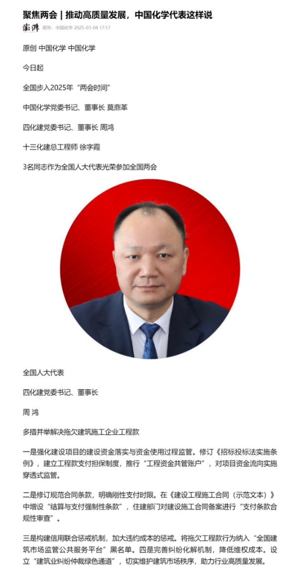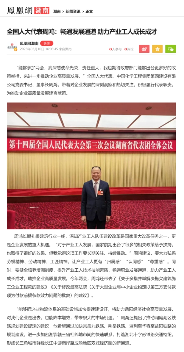 2025年全國兩會(huì)期間,全國人大代表,中國化學(xué)四化建黨委書記、董事長周鴻向大會(huì)提交《關(guān)于加強(qiáng)產(chǎn)業(yè)工人隊(duì)伍建設(shè)的建議》《關(guān)于多措并舉解決拖欠建筑施工企業(yè)工程款的建議》《關(guān)于推動(dòng)洞庭湖區(qū)常岳九鐵路、荊岳鐵路、監(jiān)利至華容至益陽鐵路規(guī)劃建設(shè)提速的建議》《關(guān)于修改最高法院〈關(guān)于大型企業(yè)與中小企業(yè)約定以第三方支付款項(xiàng)為付款前提條款效力問題的批復(fù)〉的建議》等4條建議,受到主流媒體深入報(bào)道,引起社會(huì)各界廣泛關(guān)注。