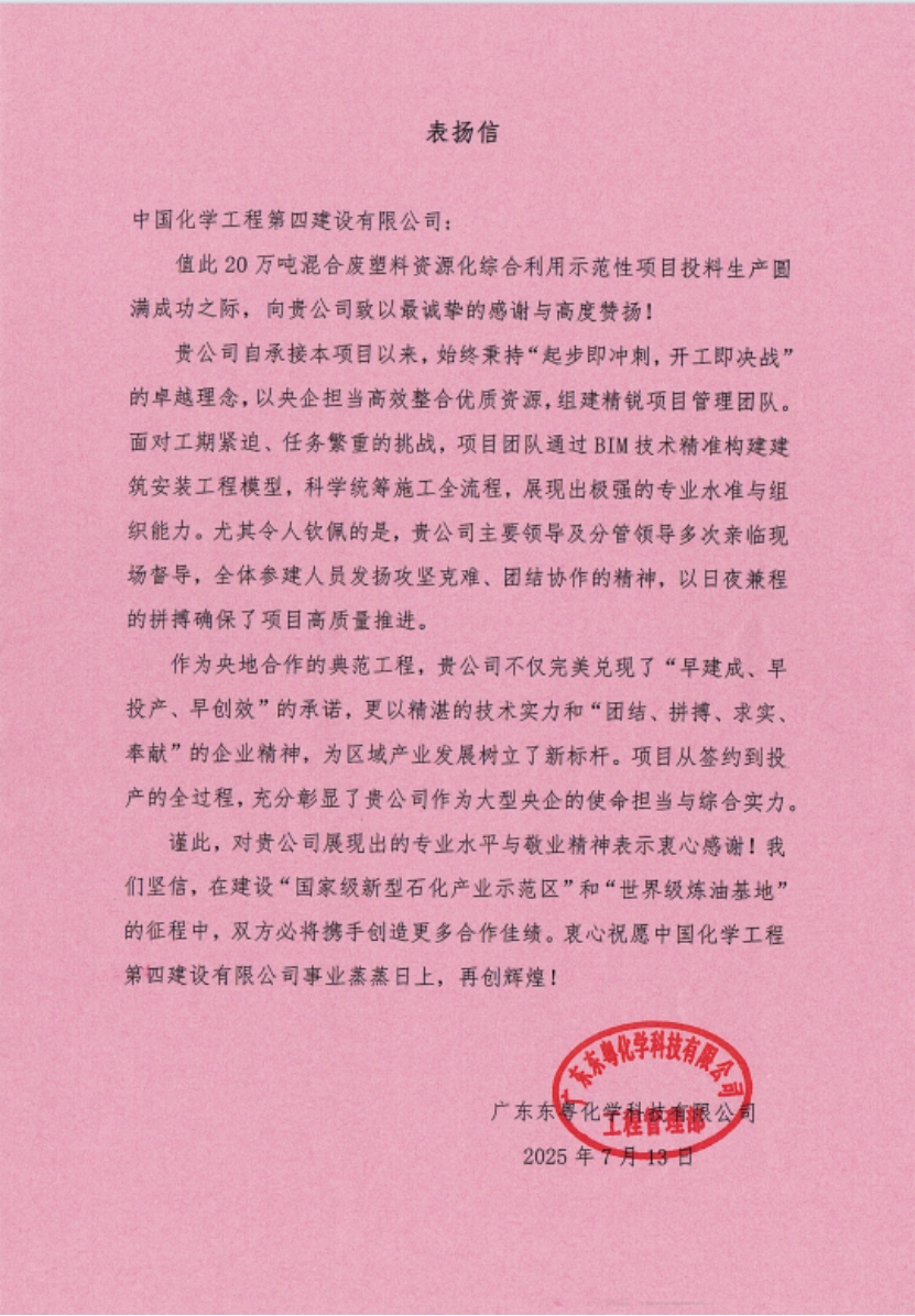 近日,中國化學(xué)四化建被廣東東粵化學(xué)科技有限公司授予“優(yōu)秀承包商”稱號,并收到其發(fā)來的表揚(yáng)信,對公司承建東粵化學(xué)20萬噸/年混合廢塑料資源化綜合利用示范性項(xiàng)目期間展現(xiàn)的專業(yè)實(shí)力、央企擔(dān)當(dāng)與拼搏精神給予高度評價,盛贊雙方是合作共贏的典范。