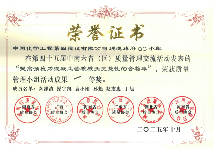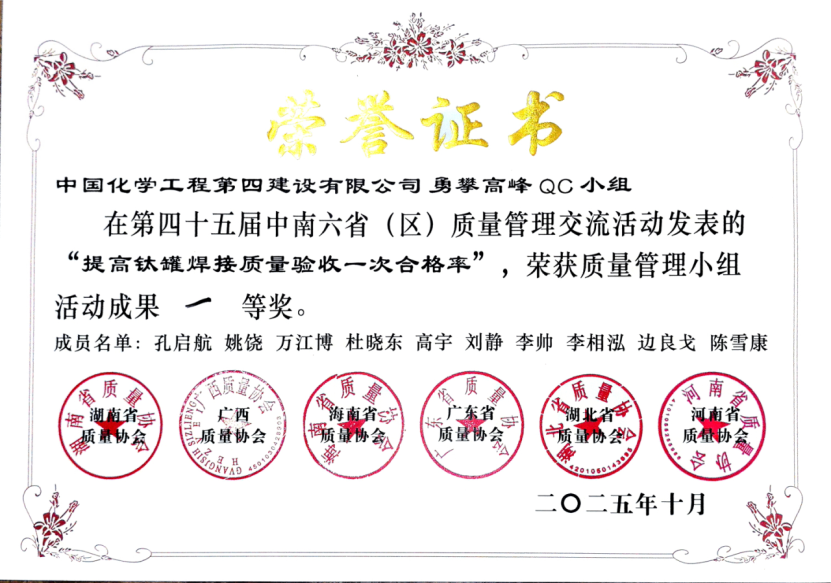 10月9日至12日,第45屆中南六省(區(qū))質量管理交流會在湖南鳳凰召開,中國化學四化建選送的“理想臻府QC小組”成果《提高預應力混凝土管樁樁頭完整性的合格率》與“勇攀高峰QC小組”成果《提高鈦罐焊接質量驗收一次合格率》,在會上雙雙榮獲一等成果獎,彰顯公司在質量管理創(chuàng)新領域的扎實實力。