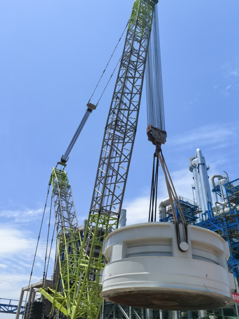 這兩臺設備中的4R101氧化反應器直徑9.1米、高4.4米、中間段凈重410噸, 4R102氧化第二反應器凈重390余噸。面對設備體積龐大、現場作業空間受限及風力不穩定等難題,項目團隊采用單機抬吊工藝,主吊選用650噸履帶吊搭配310噸超起配重,制定詳細預案進行模擬演練。吊裝過程中,技術人員全程監測風速、設備姿態及受力數據,歷時兩天將這兩臺巨型設備毫米級精準吊裝就位,受到業主的一致好評。